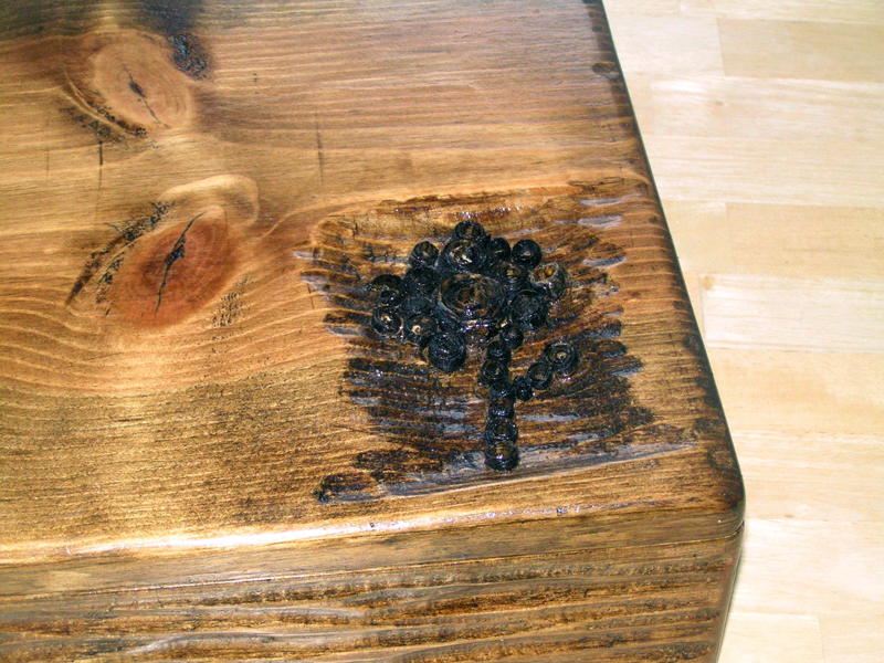 Monogramed, cherry stained pine tea box with hand chiseled natural texturing and wood chip flower feature. Removable textured organizer grid upon cushioned, heavy weight, burgundy linen.
